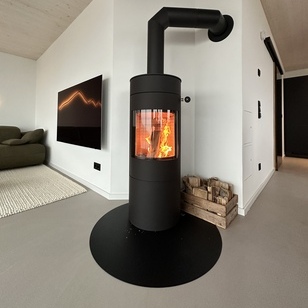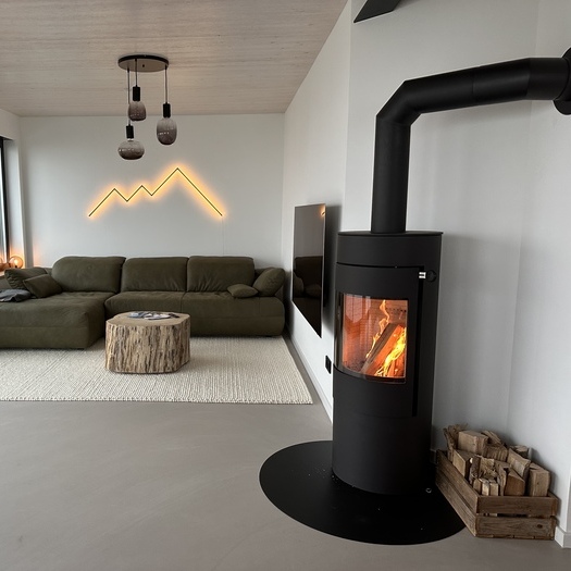 «Auf der Suche, nach einem schlichten, modernen, aber trotzdem klassischen Holz-Kaminofen wurden wir in der Ofen-Galerie Stefan Grams in Düsseldorf auf den VIVA 120 L aufmerksam und haben uns nach kürzester Zeit für ihn entschieden», erklärt Timo Tiefenthal, «die Ausrichtung des Kaminofens haben wir so gewählt, dass man das Feuer aus jeder Ecke des offenen Koch-, Ess- und Wohnbereiches geniessen kann.»