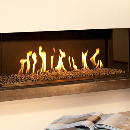 Die rahmenlose Glasscheibe bietet einen ungestörten Blick auf die Flammen und das Design lässt sich gut in verschiedene Innenraumgestaltungen integrieren. Durch die Wahl diverser Innenverkleidungen und Füllungen wie Keramik-Holzscheite, Cryponite und Steine kann der Gas-Kamin individuell gestaltet werden.